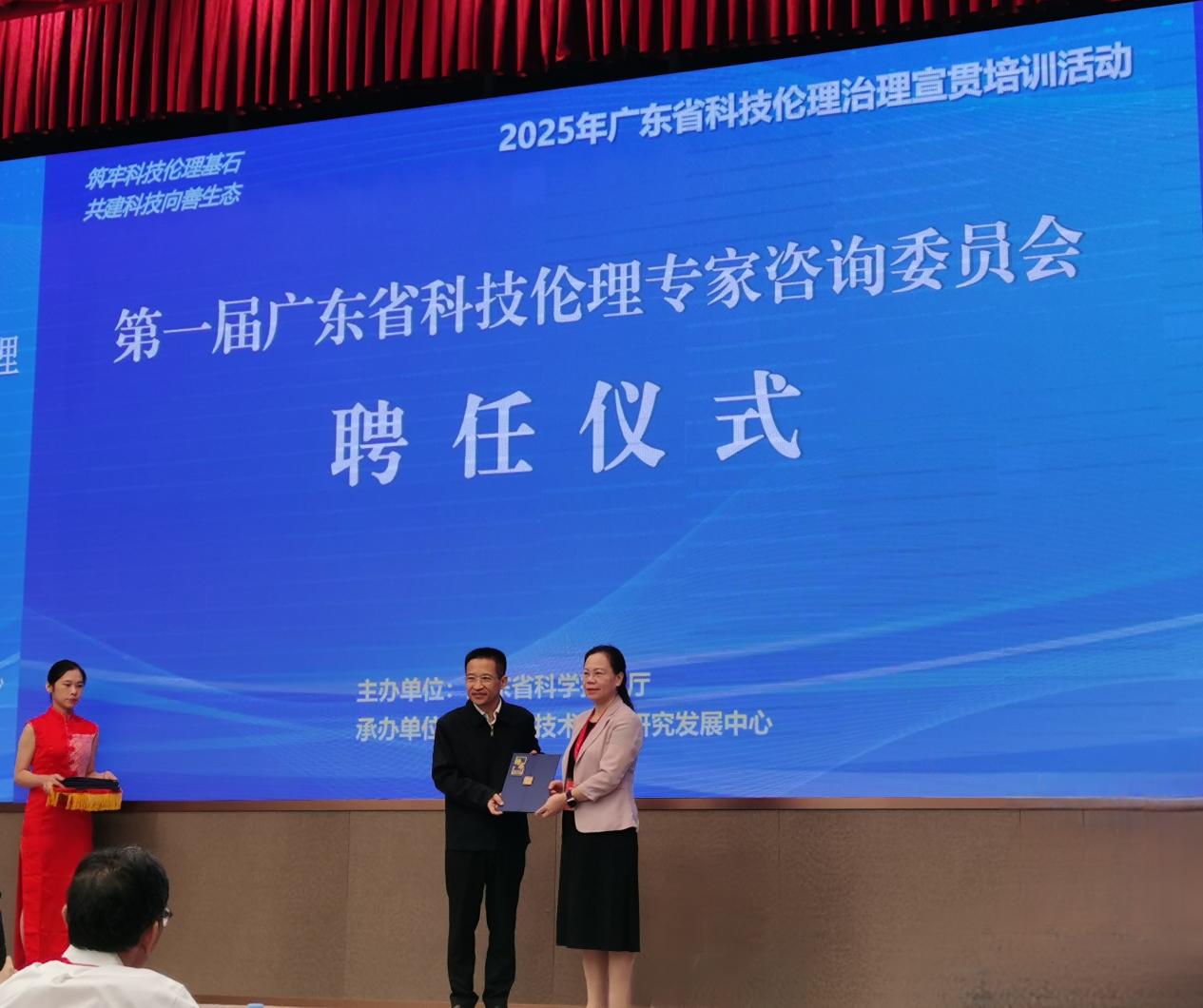 活动现场举行了第一届广东省科技伦理专家咨询委员会聘任仪式,省科技厅党组书记龚国平为委员们颁发了聘书。我校教师范冬萍教授受聘为第一届广东省科技伦理专家咨询委员会委员。