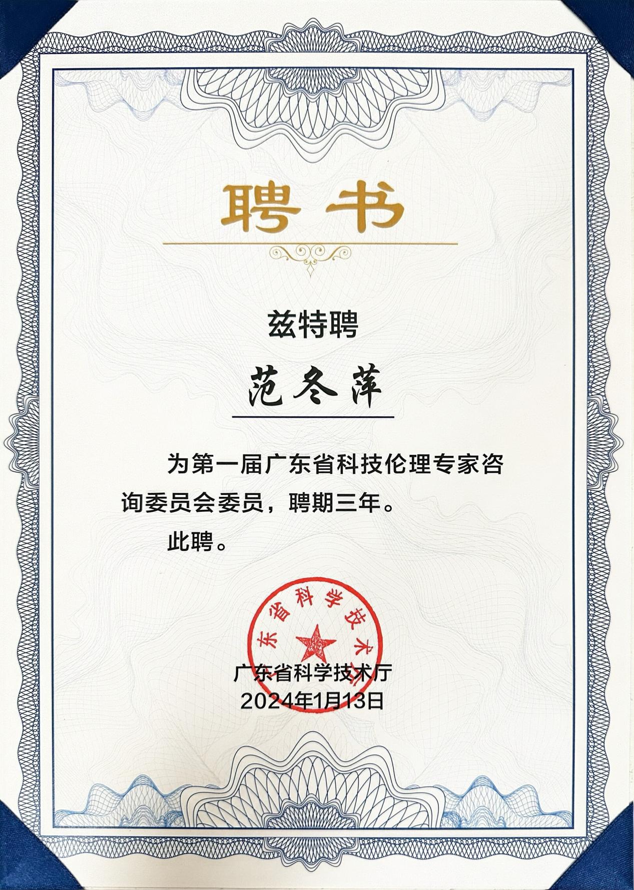 图3:范冬萍担任第一届广东省科技伦理专家咨询委员会委员的聘书